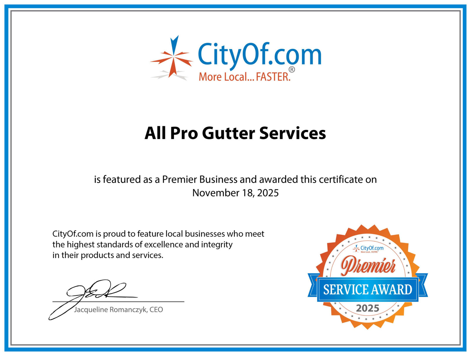 We’re thrilled to be recognized with CityOf.com “Premier Service Award for 2025” award! 🏆